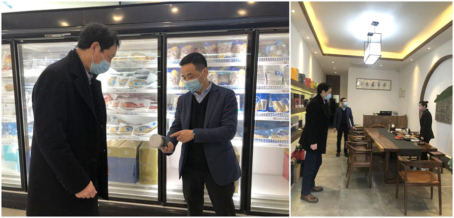 最后,洪潮书记来到放心鱼海产精品门店和茶叶品牌展示中心,对疫情期间坚守窗口单位的一线员工表示感谢和慰问,叮嘱她们务必做好个人防护和门店卫生消毒,既要做好备供货和店面展示,宣传品牌形象,恪守国企为国家服务、为人民服务、保障市场供给、稳定市场价格的基本责任,也要充分利用微信公众号、美团外卖等网络工具主动出击,做好不见面销售服务和全程无接触配送,想办法、动脑筋把疫情带来的影响降到最低。