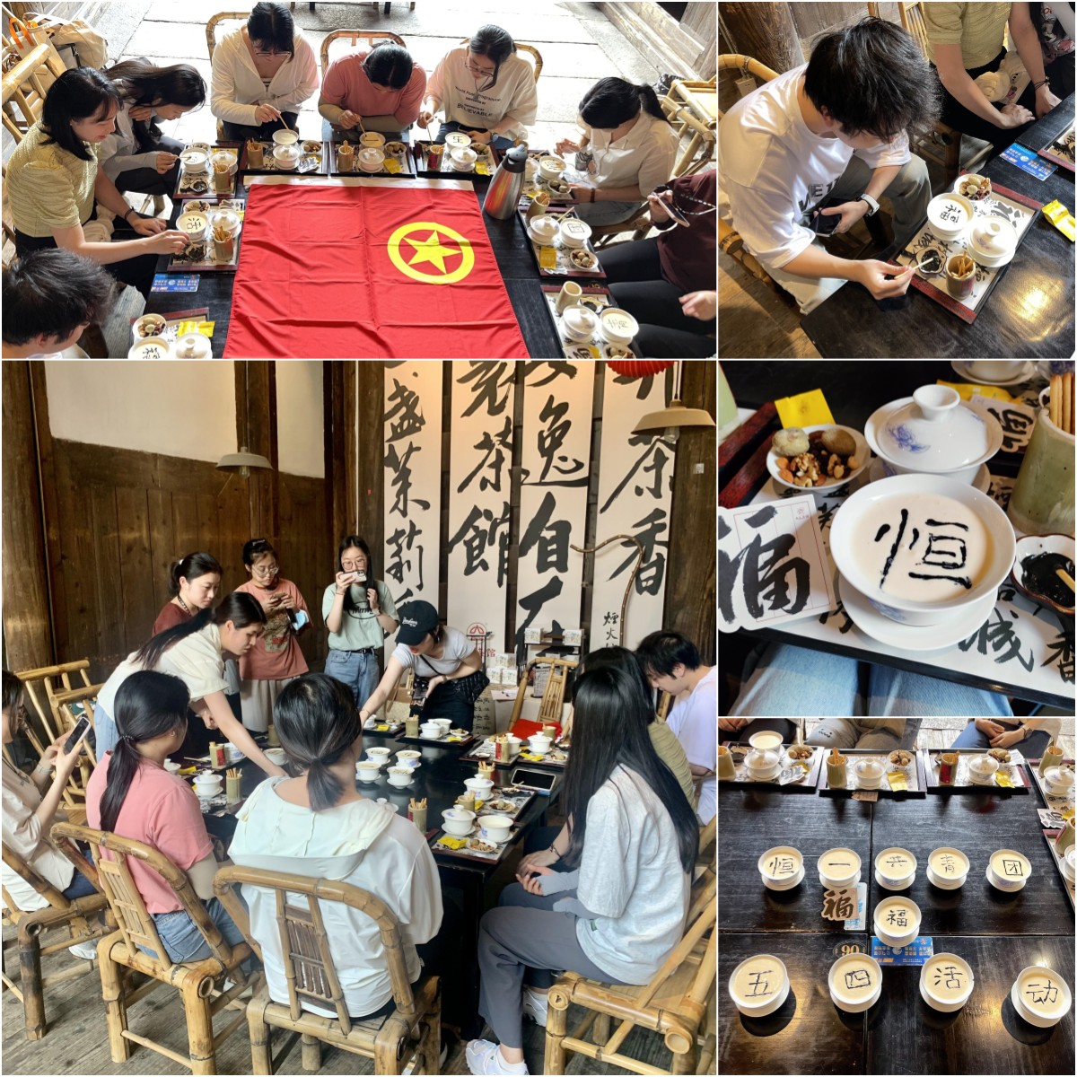 行走在上下杭,仿佛一瞬走进曾经的风雨沧桑里,中式传统砖木建筑风格与西洋建筑风格的叠加,相互碰撞,相互融合,展现百年商埠繁华。公司青年员工在浓厚历史文化氛围中体验“墨染茶香”国风书法茶饮活动,大家以色泽漆黑的芝麻糊为墨,醇厚乳白的奶盖为纸,酥脆的手指饼干为笔,以接力的形式写出“福”“恒一共青团五四活动”等文字,表达对青年节的祝福和未来的期盼。